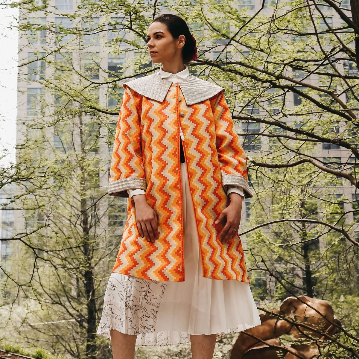 Want a tailored orange pattern jacket? House of Gharats is passionate about sourcing the most beautiful hand printed & woven Indian textiles, supporting age-old textile arts & crafts.